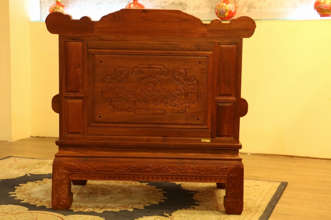 該款沙發整體之表現顯得極為嚴密厚實,無一處鏤空之雕飾,在最上端背板處的中間部分為留有一些花紋之邊幅加以修飾,顯得極為浮美雅觀。而在其左右兩側則另雕繪有“麒麟戲珠”與“雛鳥朝鳳”兩處紋飾圖案:“麒麟戲珠”紋飾設計地較為特別,如草龍紋一般,除頭部精細雕刻外,其余四肢與形體均簡略化,身體部位采用一銜邊條帶狀的紋飾相串于圓珠內,頗顯靈動神韻;而“雛鳥朝鳳”的圖案則是在背板最上部的左右兩端,末端是饒有一圓弧之設計為修飾收尾,顯得極為婉轉柔和圓潤。紋飾的圖案為一只可愛的雛鳥深情脈脈含情注視著前方鳥鳳的場景,顯得實為溫馨。鳳凰處之設計處理地也與前面麒麟一同:頭部細化,其余簡略帶過,鳳凰處眼眸之雕飾顯得極為醒目,神情表現形態逼真,層次感和手觸感亦十分明瀝彰顯,而經燙蠟處理的表面緬花材質表現地也更為細膩淡雅,極盡奢華。